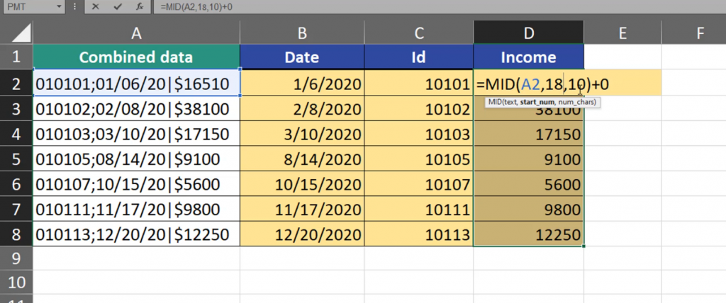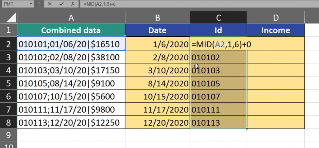 We can see that Id numbers moved to the right and the leading zero vanished. The last piece of information we want to extract is the Income. Income values don’t have a fixed width. But, since it’s the last piece of information, we can extract more signs than we need. Let’s extract also the dollar sign. The dollar sign is in the seventeenth position. We start writing the MID formula, then we add cell A2, then 17, and then we have to add the number of places we want too extract. Let’s write 10. It’s, in fact, more that we need, however it’s not less either. The MID function will extract the information to the end without any errors (Fig. 6).